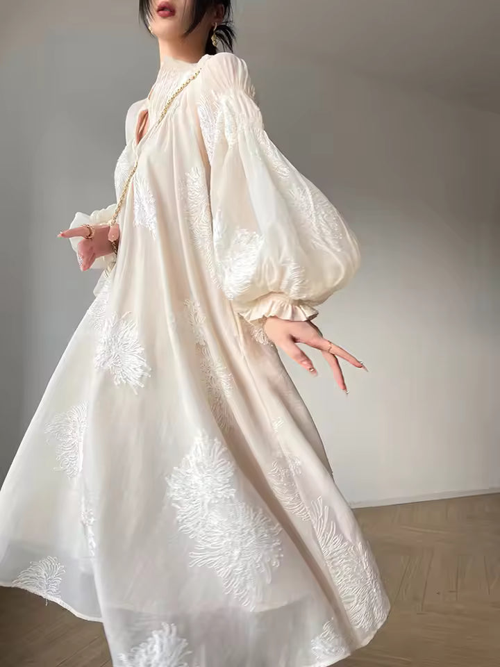 Die zarte Blumenstickerei verleiht dem Kleid eine feminine und hochwertige Optik. Die sorgfältig gearbeiteten Details unterstreichen den Vintage-Look und machen das Design zeitlos und elegant.