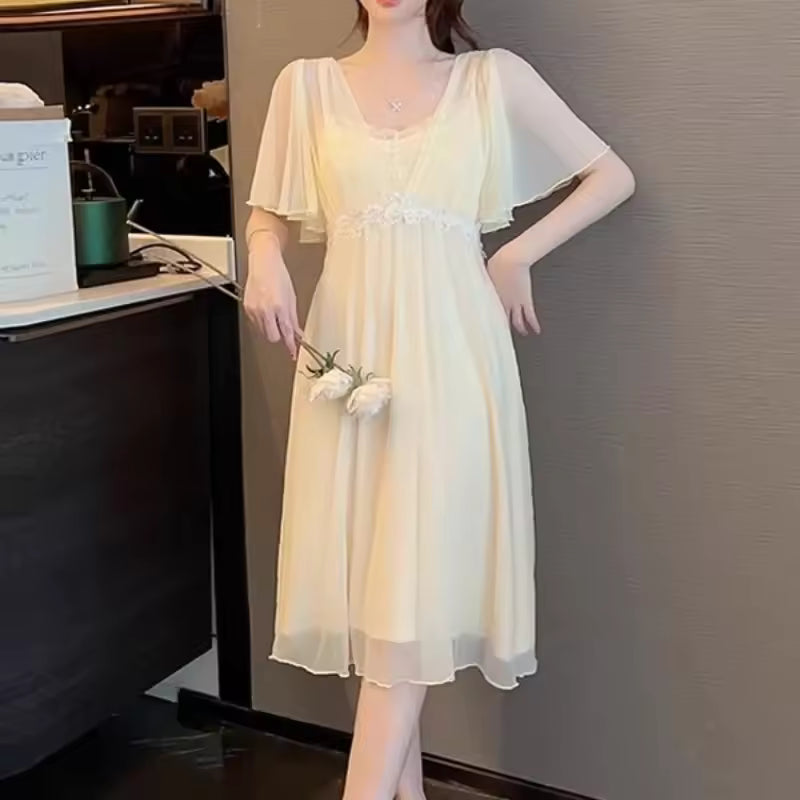 Die Spitzen- und Mesh-Elemente verleihen dem Nachthemd eine leichte, romantische und elegante Ausstrahlung.